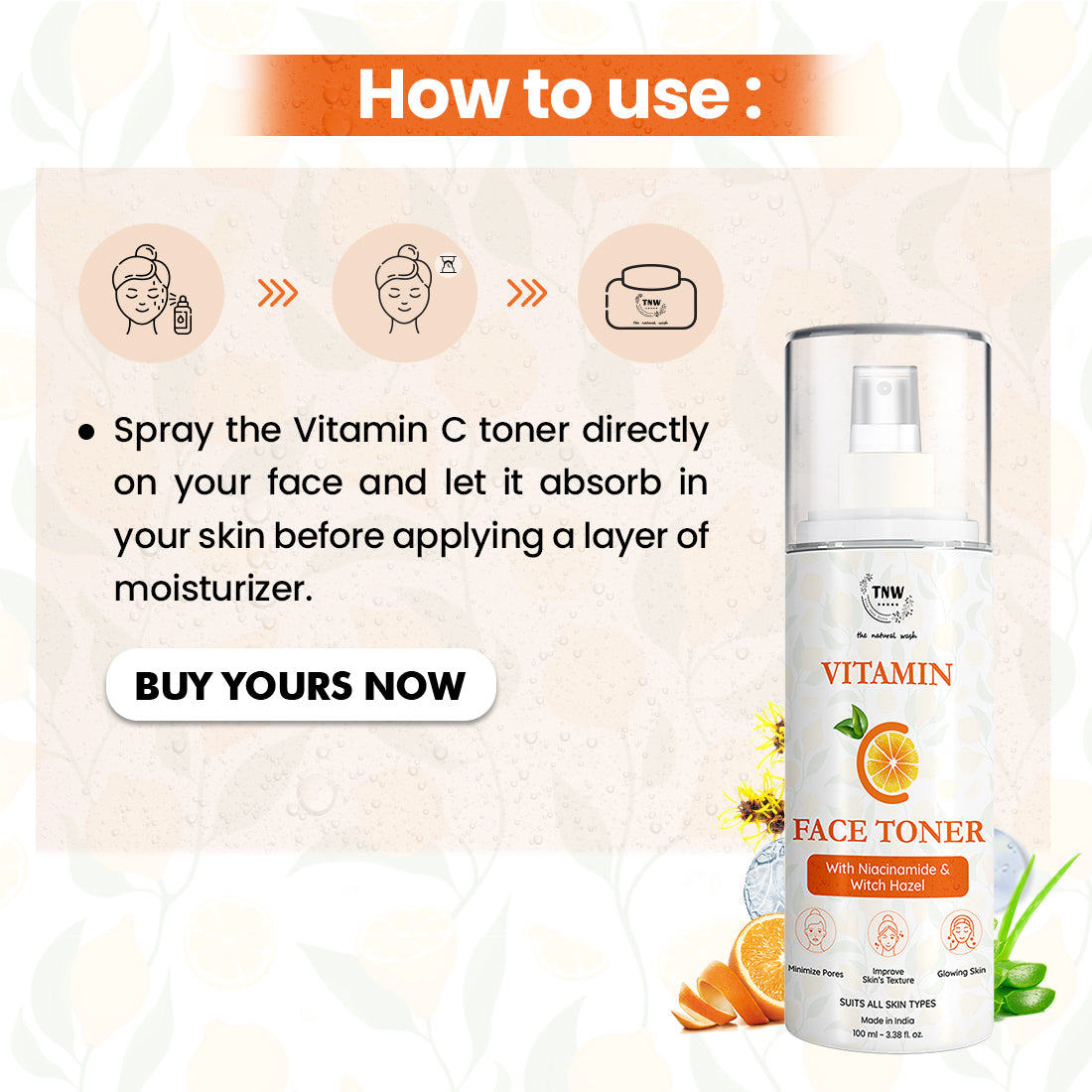 Spray the Vitamin C toner directly on your face and let it sit before applying a layer of moisturizer.