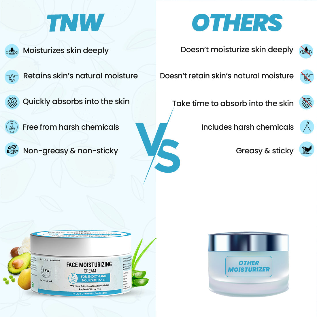 Give your skin a boost of nourishment with TNW- The Natural Wash Face Moisturizing Cream for Dry to Combination, Sensitive Skin. Packed with Shea Butter, Marula Oil, and Avocado Oil, this Moisturizing Cream is a powerhouse of antioxidants and nourishes the skin from deep within. This Moisturizing Cream heals the dry patches and gives healthy looking smooth skin, while locking in the moisture whole day. It also has Hydrolyzed Soy Protein that helps reduce the visibility of fine lines, wrinkles, and signs of aging, and Aloe Vera Extracts that calms, and repairs sensitive skin caused due to harsh environmental factors.