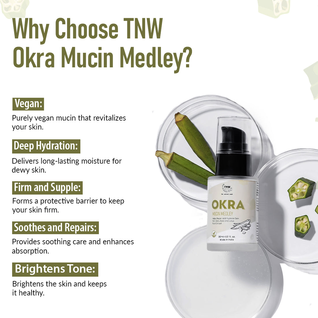 - Deep Hydration: TNW Okra Mucin Medley delivers long-lasting moisture giving you a plump and dewy skin.