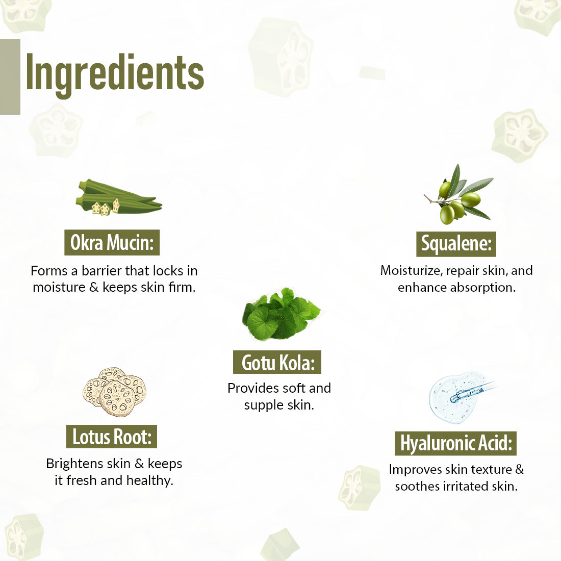 - Firm and Supple: Okra mucin forms a protective barrier to keep your skin firm and youthful.
