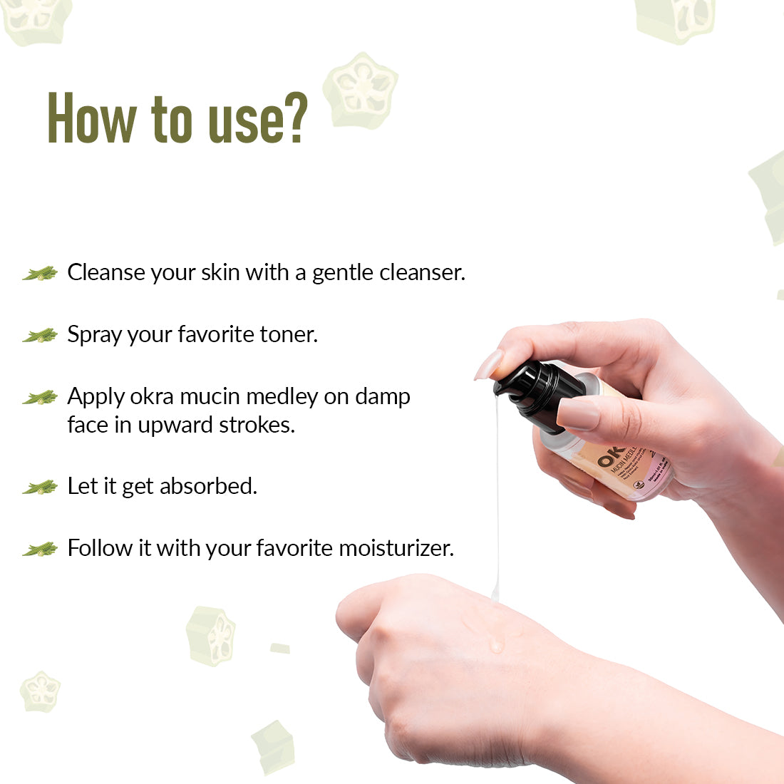 Step 3 -Apply Okra Mucin Medley on a damp face in upward strokes.