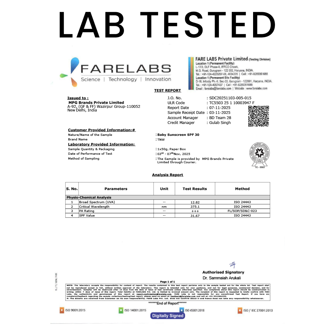TNW-The Natural Wash Baby Sunscreen is powered with SPF 30 PA+++ that protects the baby's skin from harmful UVA and UVB rays.