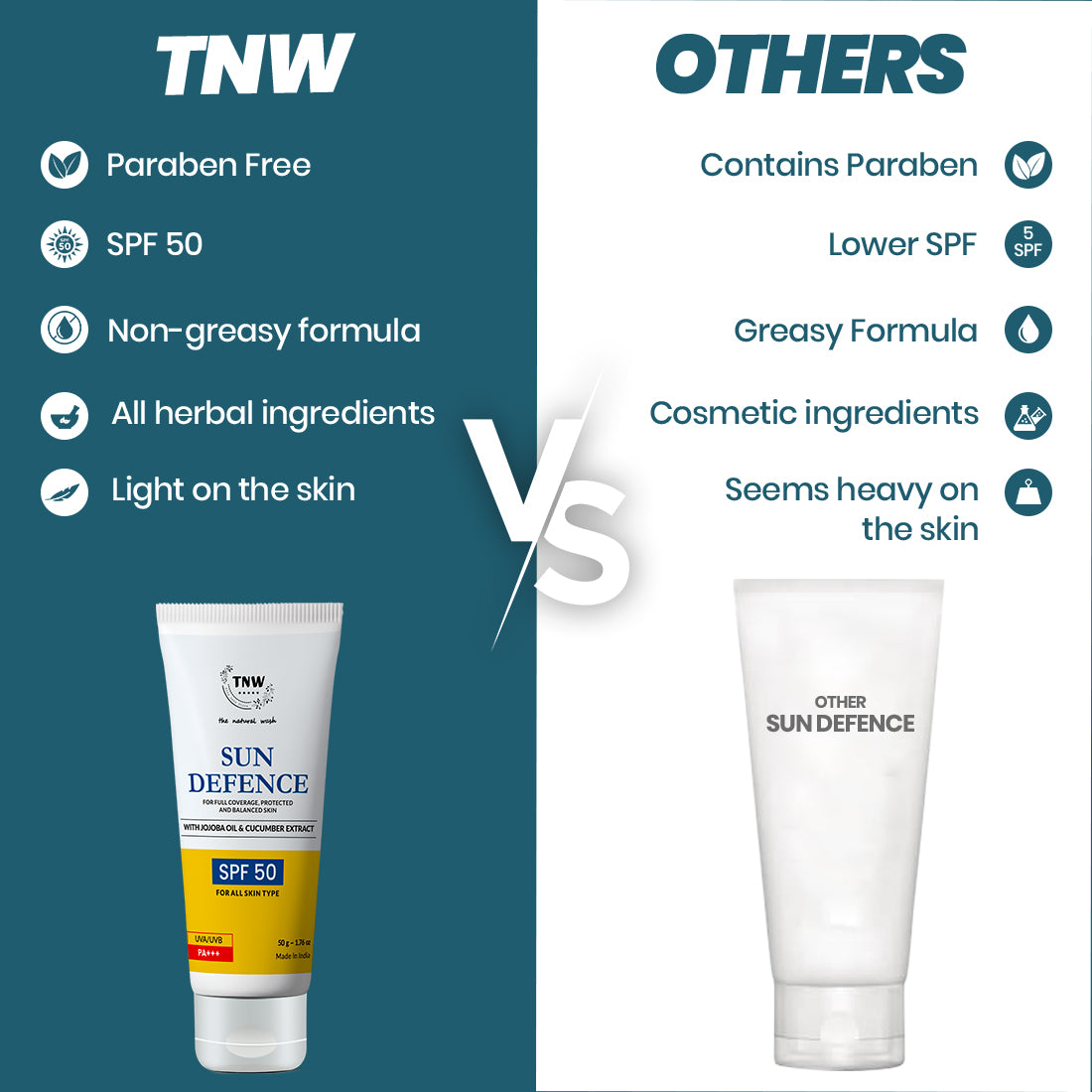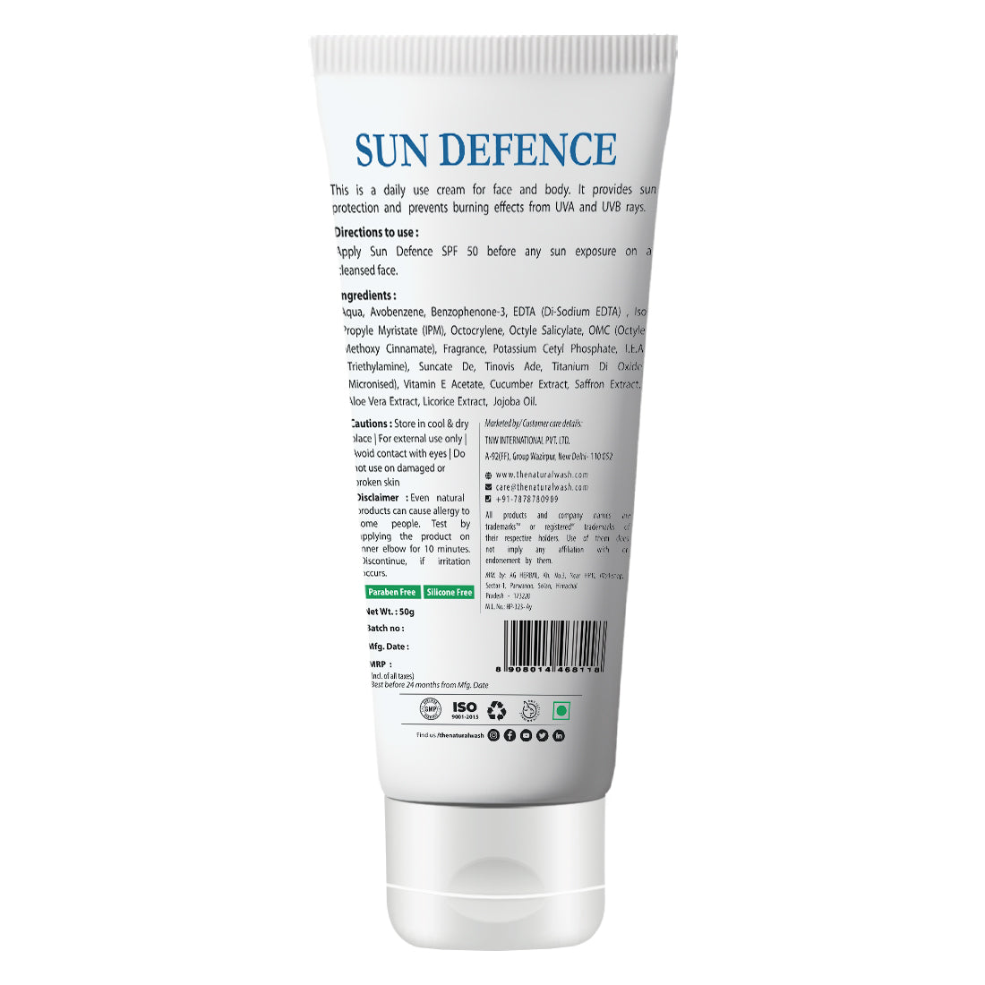 Be it any season, sunscreen is necessary to protect skin from the harmful UVA & UVB rays. Too much Sun exposure not only causes suntan but also damages skin tissue. Therefore, TNW presents, one-stop solution for your daily Sun Protection skincare in the form of TNW Sun Defence Cream. It is an all-natural sunscreen with SPF 50 that protects skin from tanning and sun damages with ease. The SPF cream evens out the skin without making the skin look greasy, oily, and patchy. It is effective on all skin types, does not feel oily, protects the skin against free radical damage while maintaining even skin tone. The Natural Wash's Sun Defence Sunscreen with an SPF 50 is your best companion when you head out of your home. Formulated with herbal ingredients, this sunscreen is great for your skin and is free from parabens. It is non-greasy, lightweight, fast-absorbing, easy and convenient to use. Since it is light on the skin, this sunscreen will dissolve into your pores within minutes, so that you can carry on through your day, well protected from the harsh rays of the sun.